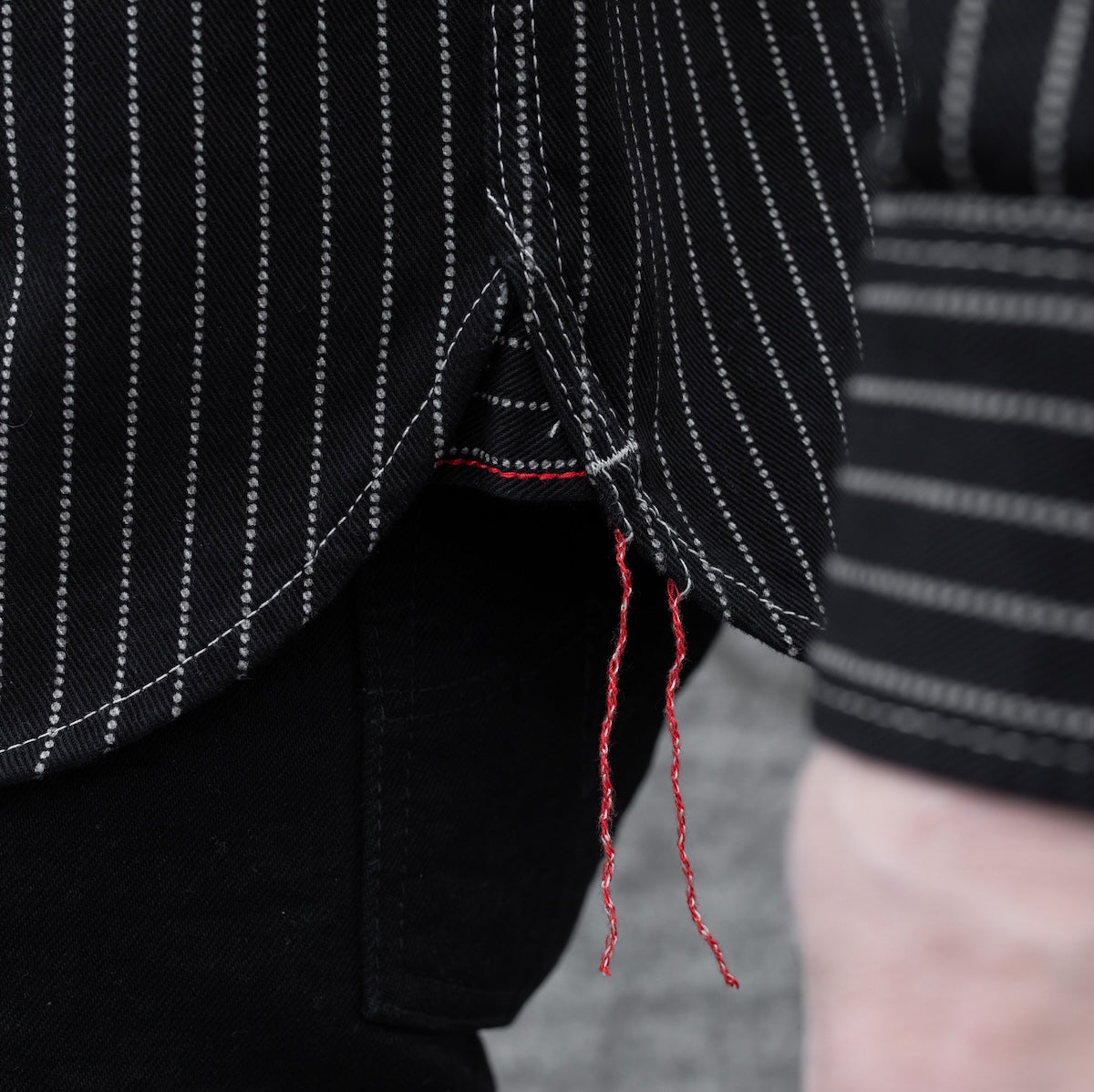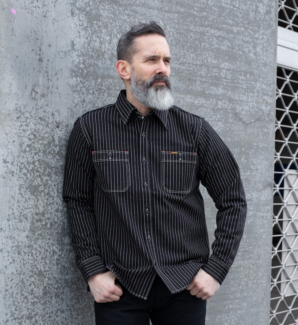 Our classic work cut shirt made from a 12oz black wabash fabric with black buttons, the weft and the warp are both rope dyed black and the dots are bleached into the fabric post-weave. This shirt will fade and age beautifully.