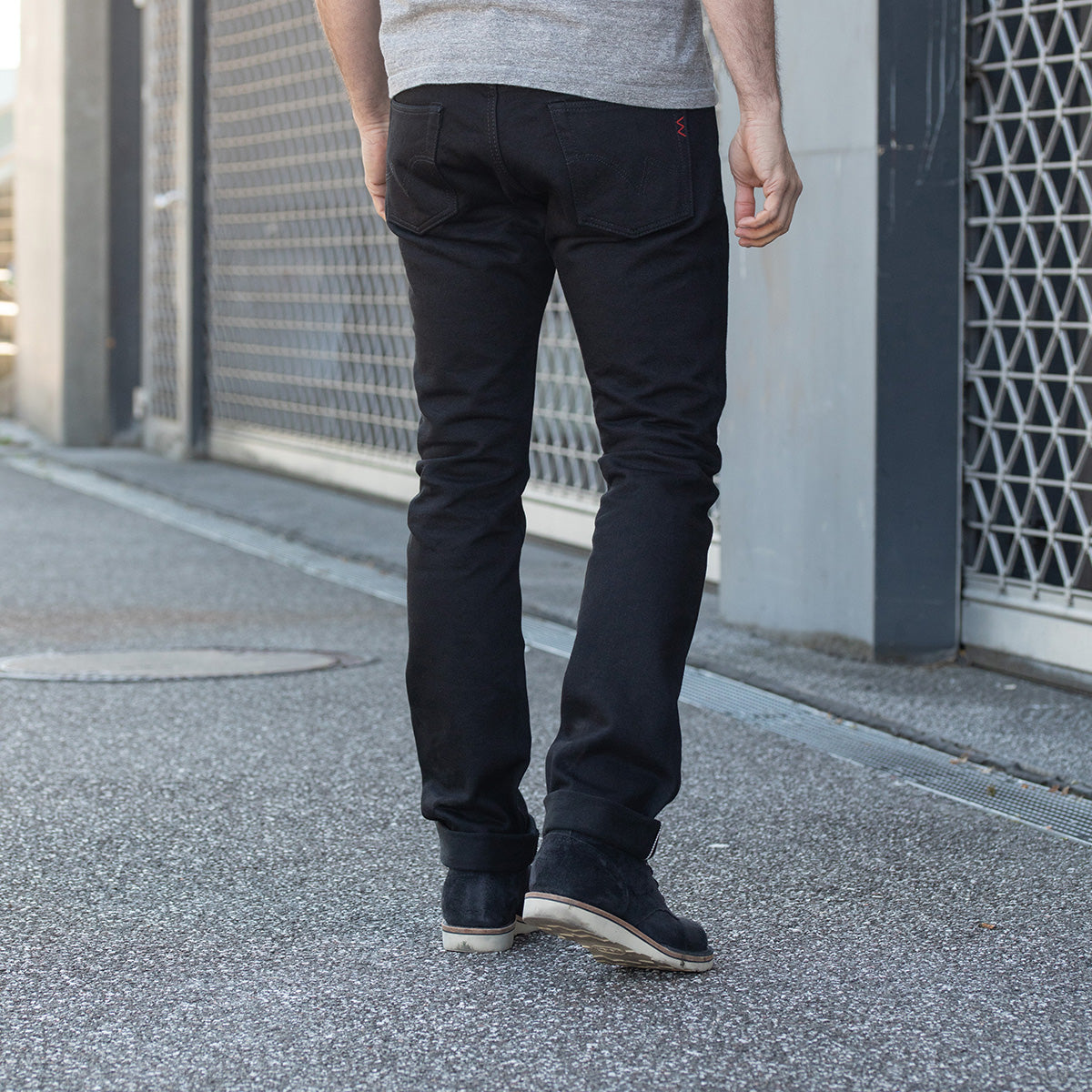 These slim-fit jeans are made from 21 oz. "Super Black Fades to Grey" (SBG) selvedge denim. This denim features a black, sulfur-dyed warp and a black, reactive-dyed weft. Over time, the warp fades, but the weft does not. The denim is heavy and sturdy yet soft and extremely breathable. Thanks to its double-twisted weft construction, this denim adapts to your body like no other.
