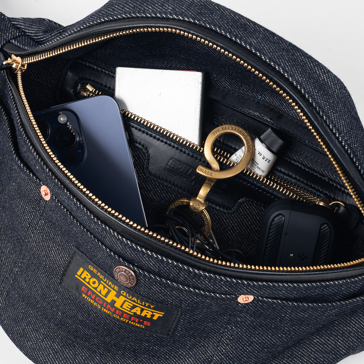 Keep your essentials close with our 21oz Japanese denim waist bag. Featuring an array of quick-access and zip-secured compartments, solid brass hardware, and fully adjustable strap. Wear around the waist or across the body.
