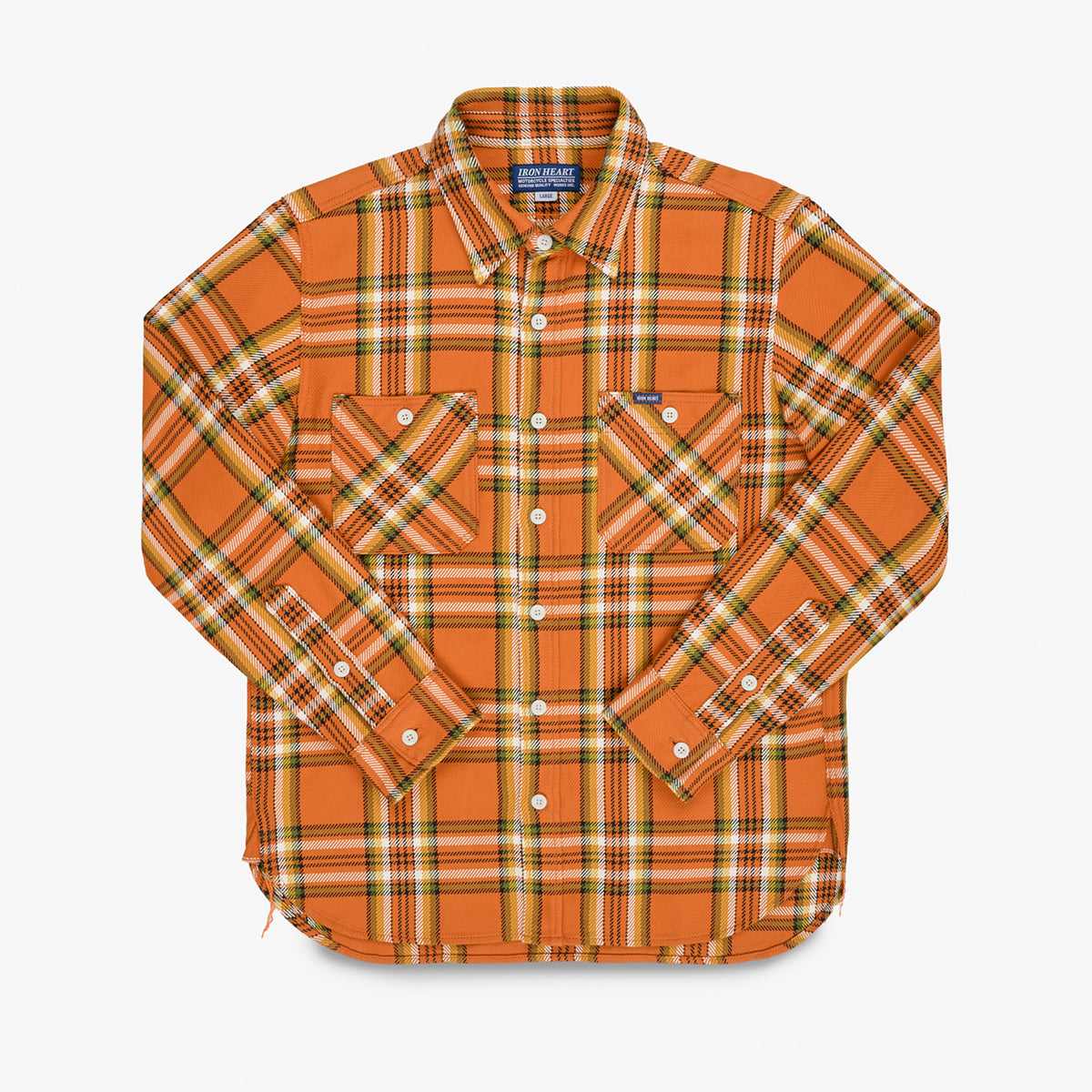 As a lighter alternative to the signature Ultra Heavy Flannel (UHF) shirts, the 9 oz. unbrushed selvedge flannel fabrics offer the classic Iron Heart style in a cooler, more breathable version for the warmer months. This year's plaid designs are a "best of" selection inspired by some of our most popular UHF color combinations from recent years. Unlike previous 9 oz. flannel fabrics, which were treated with rope and sulfur dyes to allow fading, these fabrics are woven with reactive-dyed yarns, resulting in superior colorfastness. Only four looms in Japan can produce these intricate patterns, which require changing the weft thread during the weaving process. These SS26 shirts are among the most exclusive Japanese flannel shirts available.