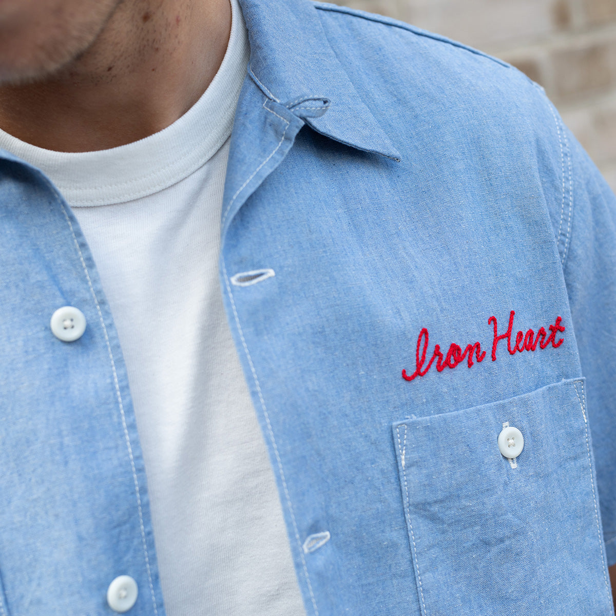 - Chainstitch embroidered Iron Heart “script” chest logo